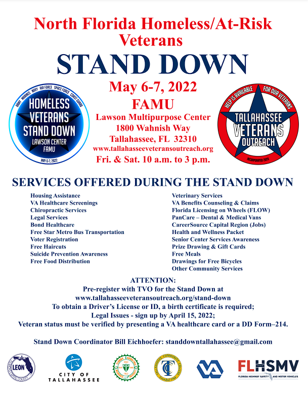 Lawson Multipurpose Center 1800 Wahnish Way,, TallahasseeSERVICES OFFERED DURING THE STANDDOWN Housing Assistance, VA Healthcare Screenings Chiropractic Services, Legal Services Bond Healthcare, Free Star Metro Bus Transportation Voter Registration, Free Haircuts Suicide Prevention Awareness, Free Food Distribution Veterinary Services, VA Benefits Counseling & Claims Florida Licensing on Wheels(FLOW), Pan Care – Dental & Medical Vans Career Source Capital Region(Jobs), Health and [...]